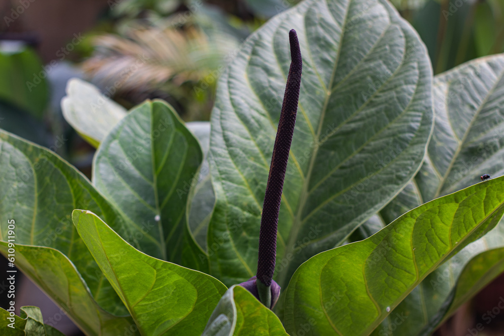 Close up of anthurium jenmanii purple flower with green leaf background. selectively focus on Variegated Anthurium Jenmanii plants