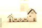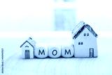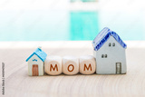 Mom text on wooden cube with miniature house over blurred background, mother's day greeting card background idea
