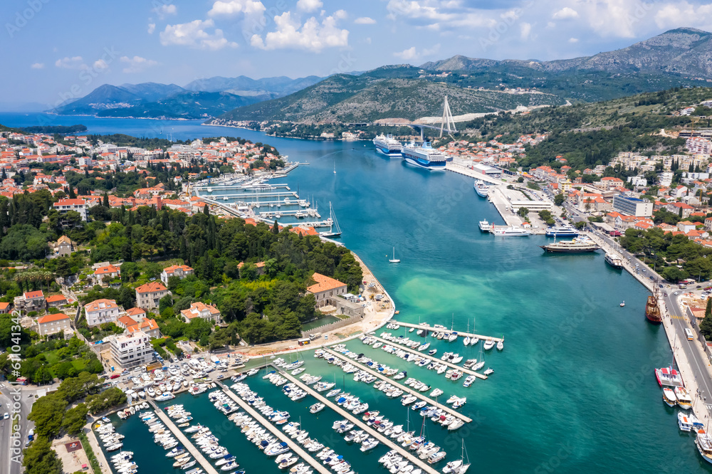 Dubrovnik marina and harbor at Mediterranean sea vacation Dalmatia aerial photo view in Croatia