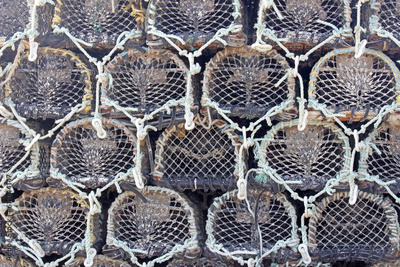 Crab cages or lobster pots stacked up creates a nautical background pattern