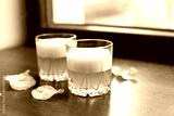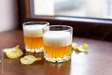 Two glasses of fresh delicious light unfiltered beer and potato chips on wooden windowsill