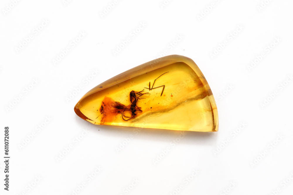 Amber with inclusionon ant a white background. Sun stone. Fossil fossilized resin. semi-precious mineral. Natural material for jewelry. Copal. Science and geology. Insects in amber stone. fly