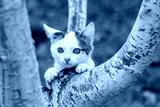 A white spotted cat with big eyes climbs a tree. Cat in the wild