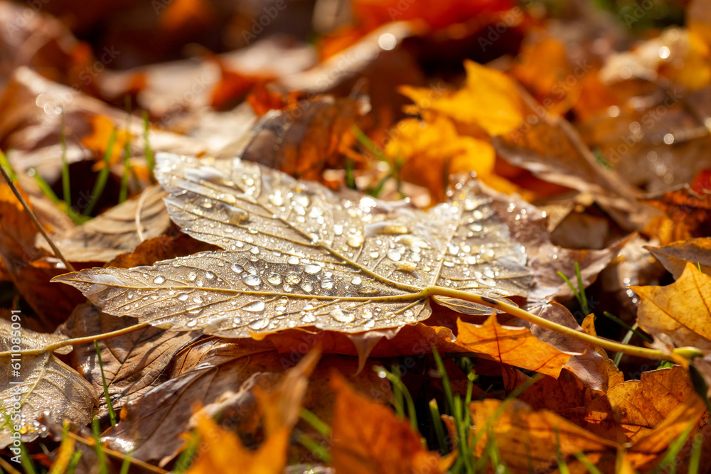 Yellow Autumn Leaves Drenched in Raindrops on the Wet Ground