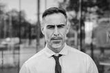 Individual close up portrait of serious mature businessman looking pensive at camera at workplace. Successful handsome corporate male executive ceo standing with confident and toughtful attitude. High