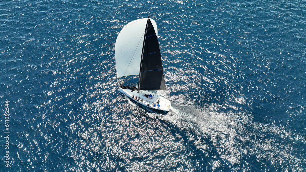 Aerial drone photo of beautiful sailing boat with white sails cruising deep blue Aegean sea, Greece
