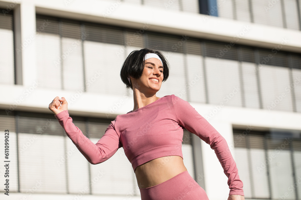Healthy young woman running in morning outdoors at city streets