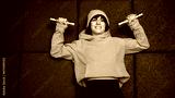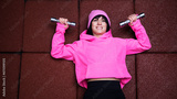 Athletic woman doing arms exercises. Photo of a muscular fitness model working out with dumbbells on a gray background. Strength and motivation