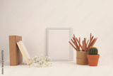Office table (shelf) with empty frame and decorative objects. Copy space creative Ligt beige workspace.