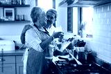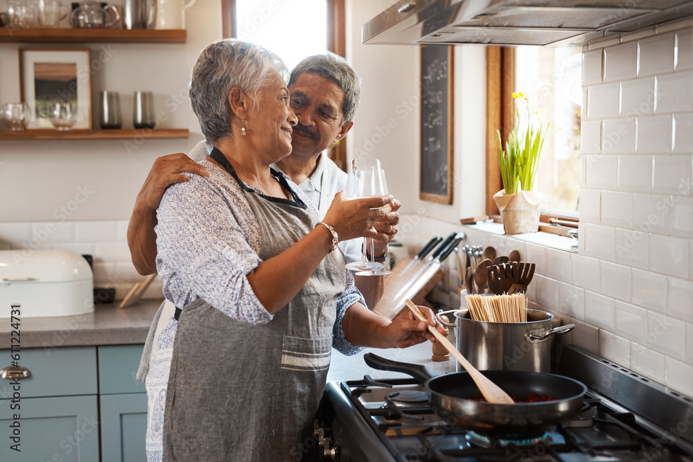 Cheers, wine and old couple at in kitchen cooking food together at stove with smile, love and romance. Toast, drinks and senior woman with man, glass and happiness to make dinner meal in retirement