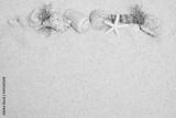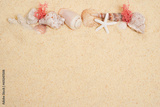 Seashells with starfish, seaweed on sand background. Sea summer vacation frame card with space for the text