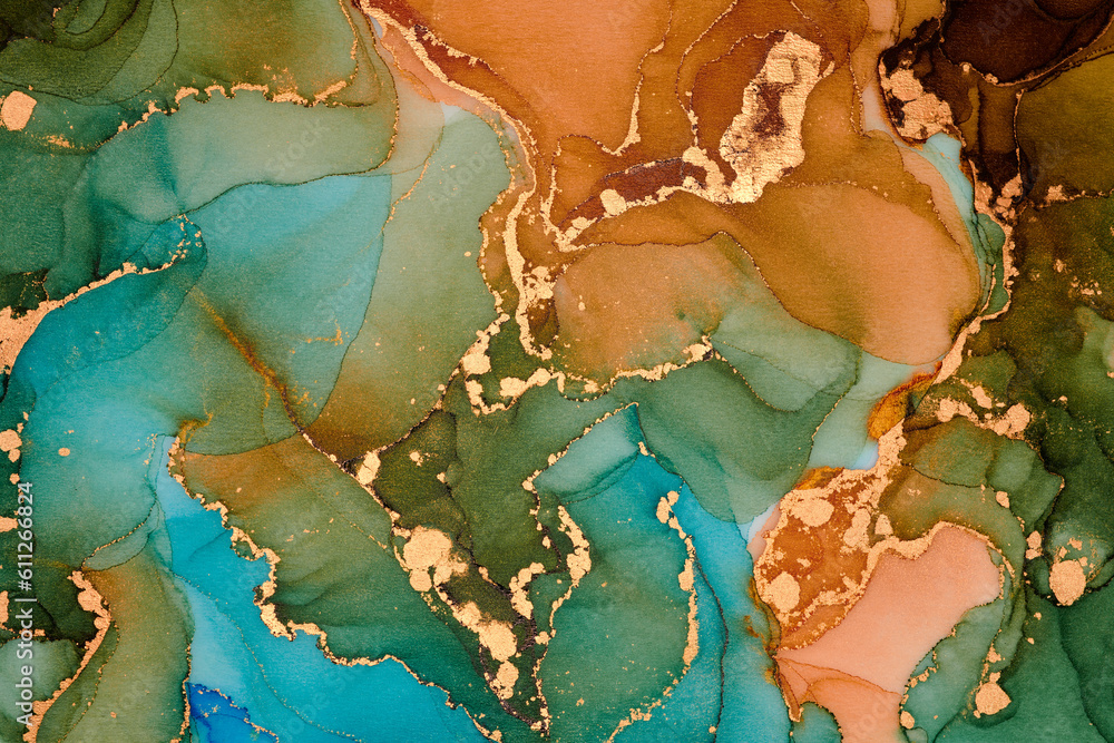 Natural luxury abstract fluid art painting in alcohol ink technique. Tender and dreamy wallpaper. Mixture of colors creating transparent waves and golden swirls. For posters, other printed materials