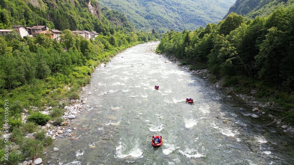Go rafting on the river with dinghies immersed in the rapids of the stream and the nature of the canyon in Val Sesia Alagna Piedmont Alps mountains - drone view of summer water sport activities