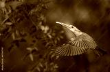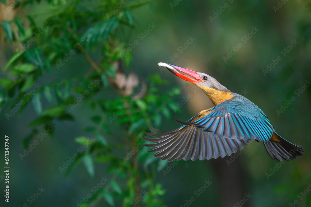Stork-billed kingfisher flying , bird with large beak likes to eat fish