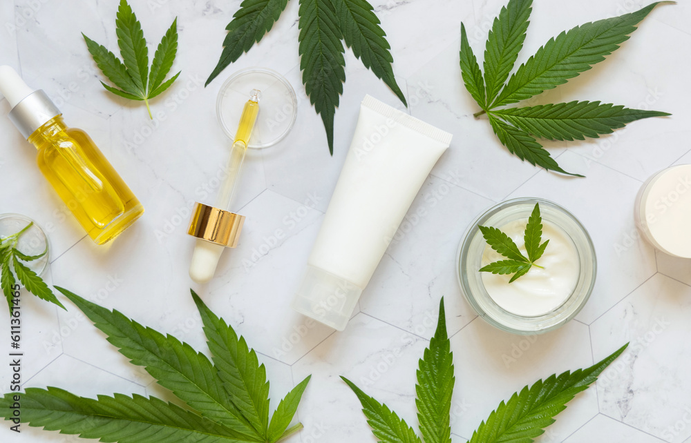 Cosmetic bottles, jars and tubes with blank label near green cannabis leaves. Mockup