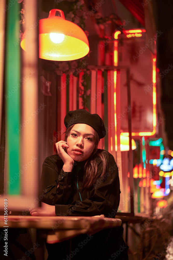 Vertical view of the young stylish brunette sitting in cafe in lights of night city