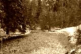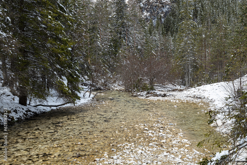 View of a Rienz river in a snowy winter day; Toblach (Dobbiaco), Bolzano, Italy; Dolomites