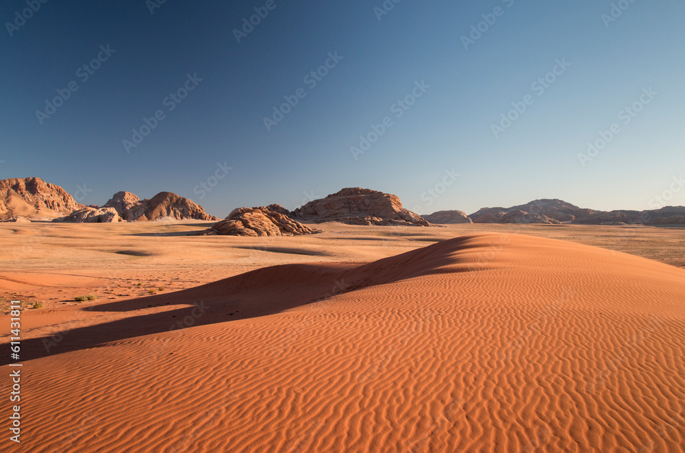 sand dunes and mountans in the desert before sunset, Wadi Rum, Jordan