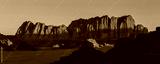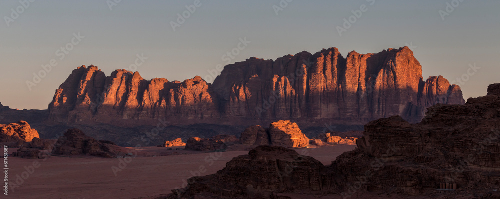 dramatic sunrise painting red the sandstone cliffs i nthe desert, Wadi Rum, Jordan