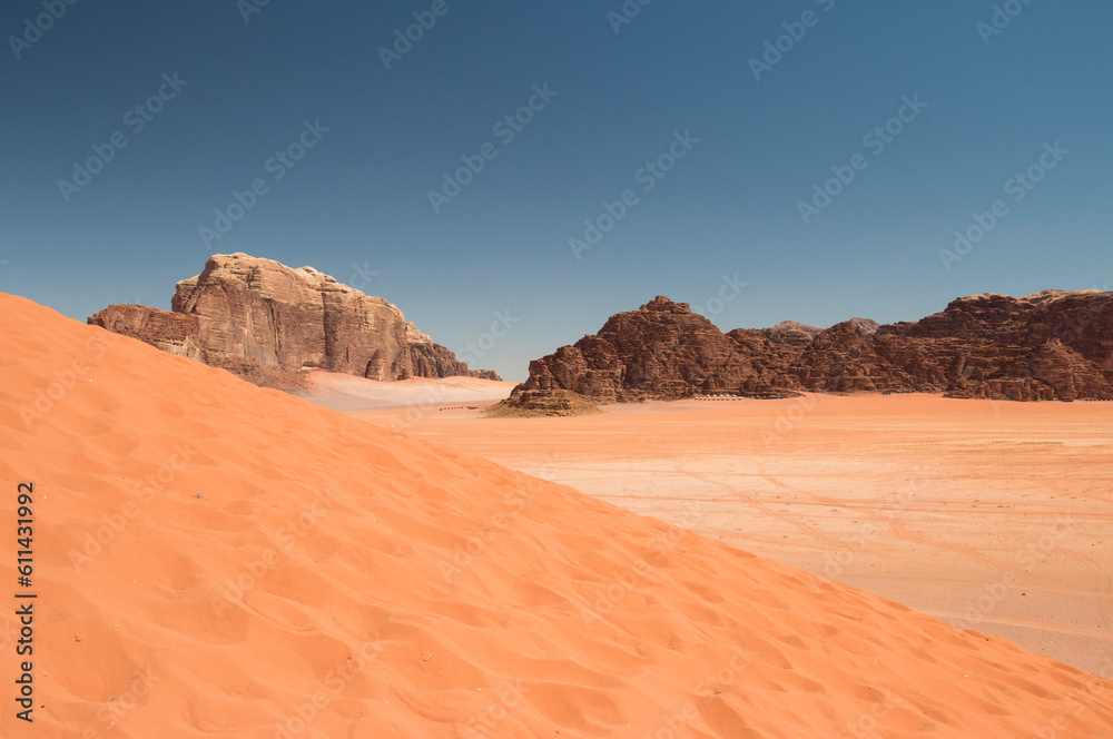landscape with sandune and rocky mountains in Wadi Rum country, Jordan