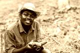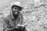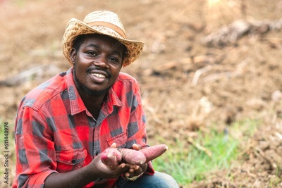 African farmer man holding fresh sweet potato at organic farm with using tablet.Agriculture or cultivation concept