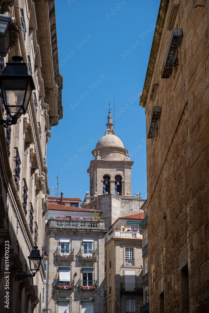 view of a street in the city of Ourense, Galicia. Spain. Houses and a tower of the cathedral.