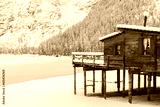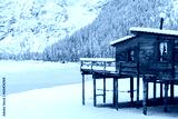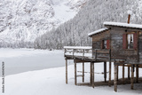 Wooden hut by the frozen Braies Lake on a snowy winter day, Dolomites, Italy
