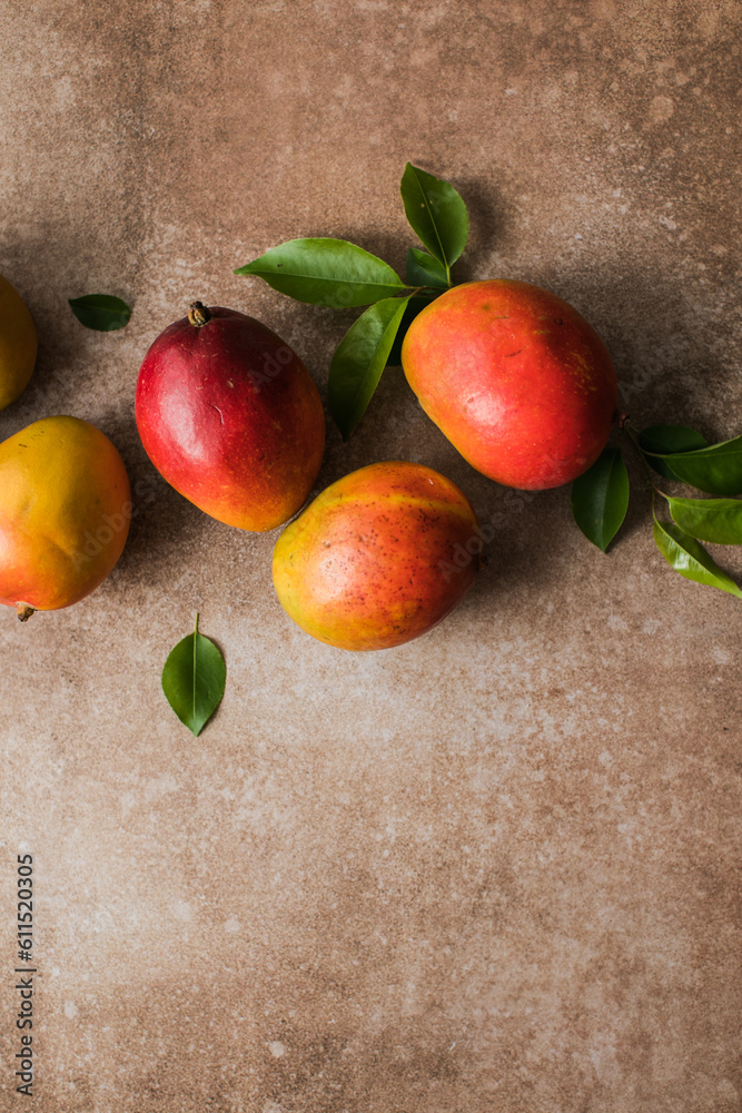 Mango background design concept. Top view of fresh mango fruit pattern with leaves on table.