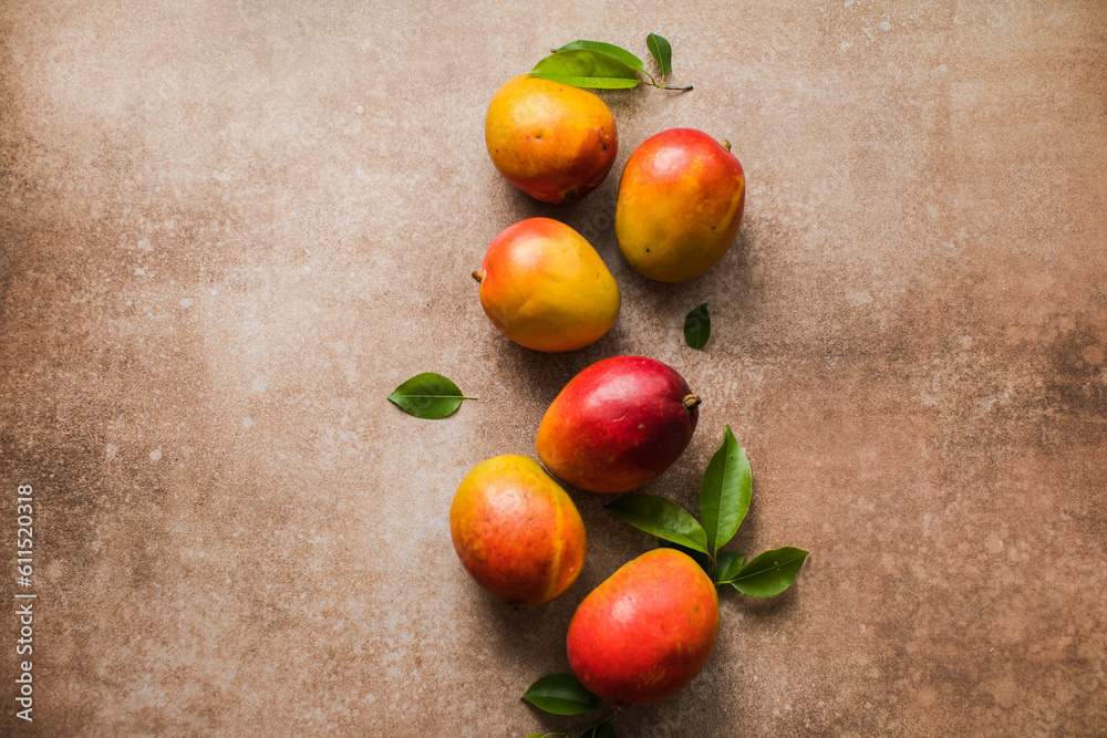 Mango background design concept. Top view of fresh mango fruit pattern with leaves on table.