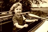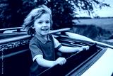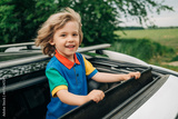 Adorable happy little boy stands in open car sunroof during trip at summer.