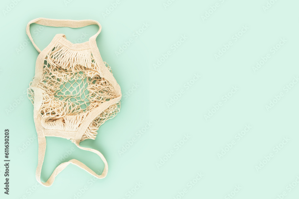 string bag on green natural background,Reusable mesh bag for eco-conscious shoppers,responsible shopping,copy space
