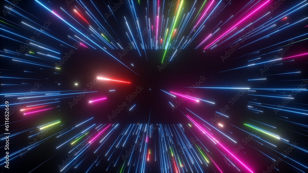 3d render, abstract colorful background. Bright neon tracing path, star tracks and glowing lines. The square shape black hole and the meteor shower