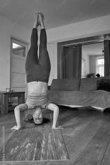 Vertical view of the brunette lady practicing yoga in hands standing pose