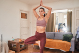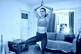 Young brunette woman keep balance, stand on one leg, yoga time at home