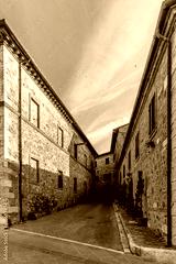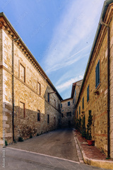 The colorful medieval houses and alleys of San Quirico d'Orcia in a sunny spring day