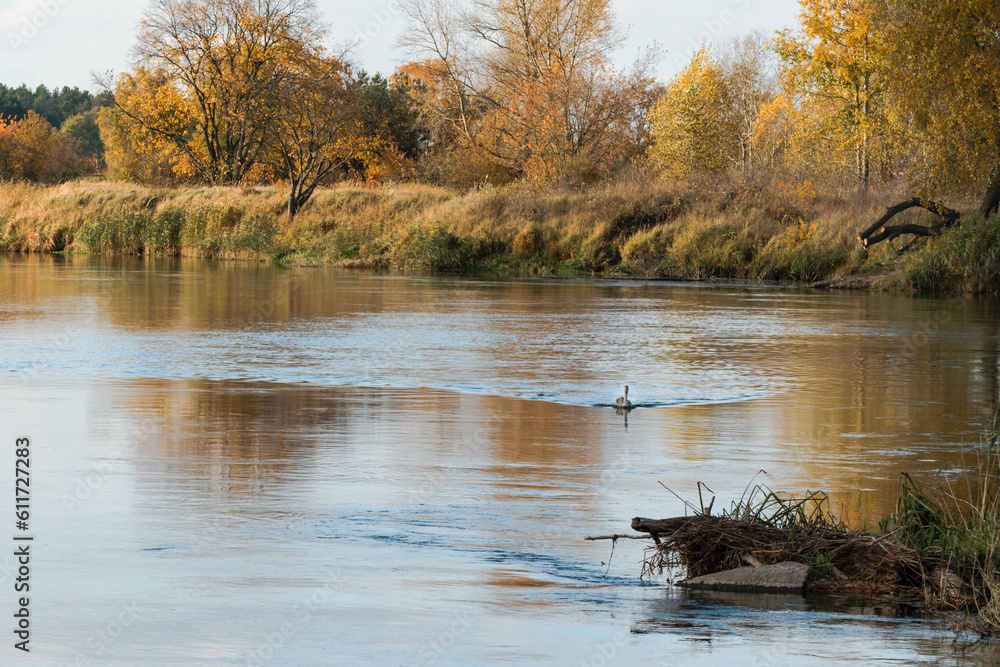 Łabędź płynący po rzece otoczonej żółtymi drzewami