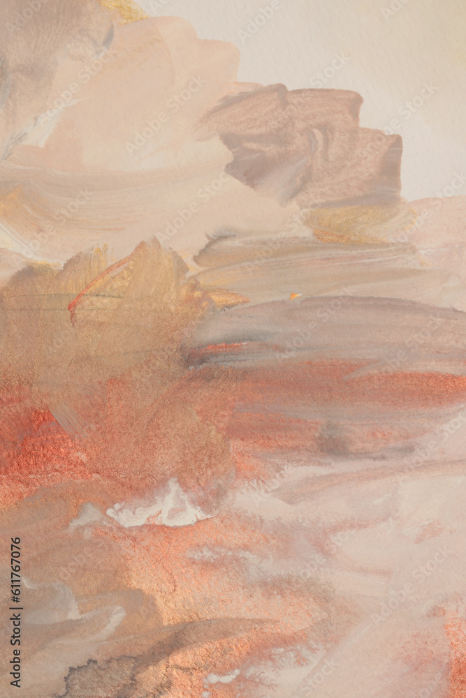 Beige, gold, bronze ink and watercolor smoke flow stain blot on wet paper grain texture background