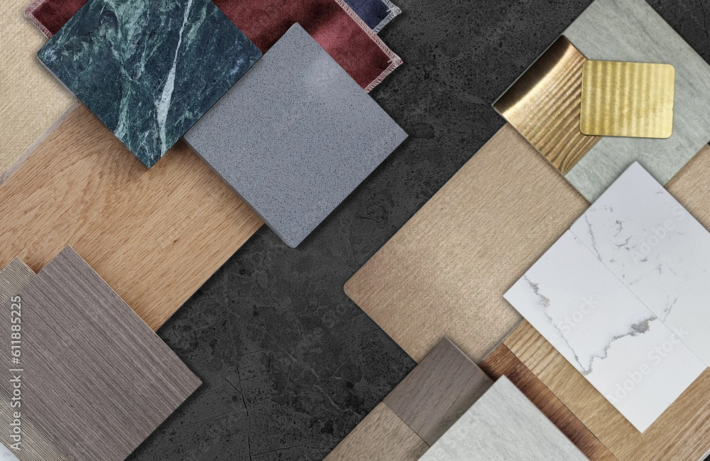 interior material samples combination including wooden veneers, artificial stones, marble stones, velvet drapery, gold metallic laminated, stone tile, gold stainless placed on black stone concrete.