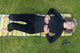 Woman exercises online. Outdoors using her smartphone. View from the top