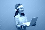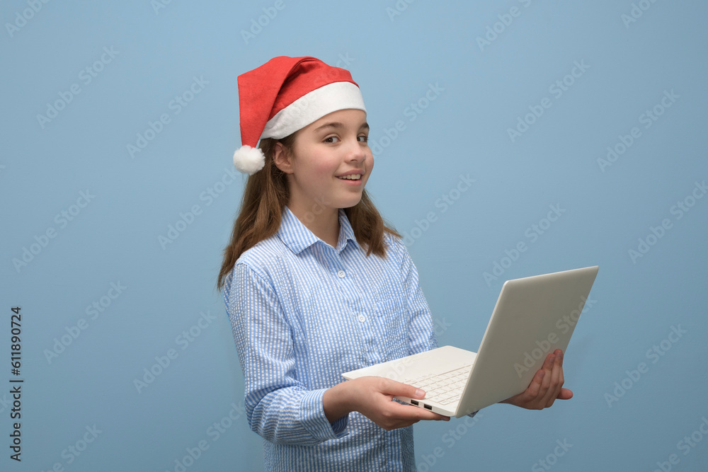 A teen girl with white laptop. A blue striped shirt and a Santa hat. An intriguing look to the viewer. On a blue background. place for text