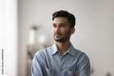 Serious thoughtful young Indian man indoor portrait. Pensive dreamy handsome businessman, entrepreneur, Internet startup manager looking at window away, thinking over creative ideas for project
