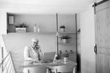 Senior woman using mobile phone while working on laptop and drinking fresh orange juice in the cafe
