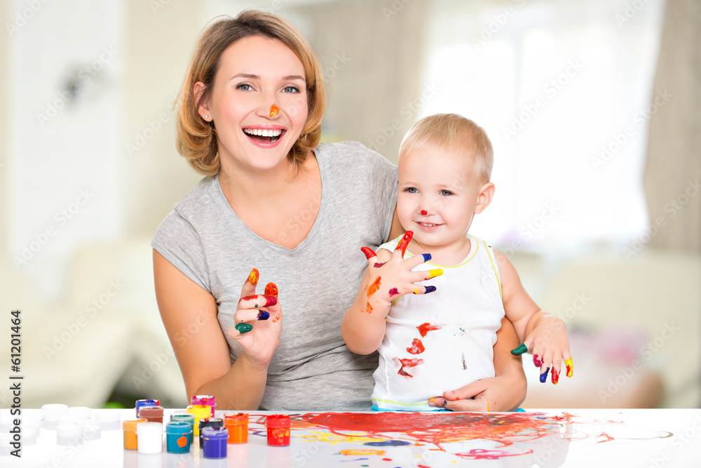 Happy child draws on the face of his mothe.