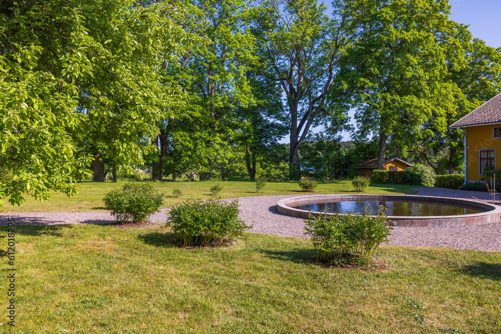Beautiful view of garden landscape design with round decorative outdoor pond on green trees background. Sweden.