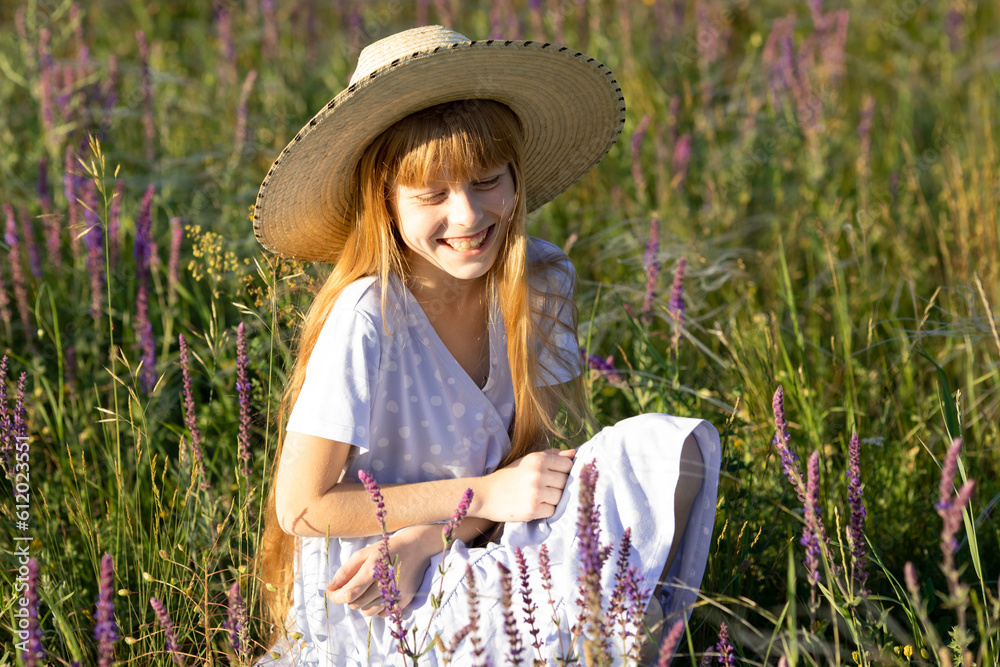 Happy little girl in a blue dress and straw hat sitting among lots of small wildflowers on the sunny summer field at sunset