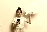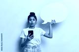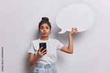 Waist up shot of stunned Indian woman holds breath from amazement holds modern smartphone and blank speech bubble reacts to something astonishing wears t shirt and jeans isolated over white background