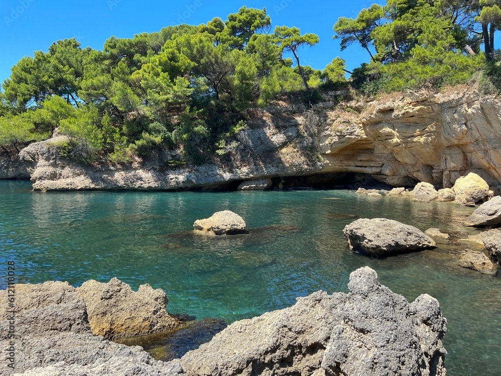 Beautiful landscape of blue turquoise sea and rocky coast.