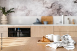 wooden table with mugs of tea and fresh pastry in modern kitchen