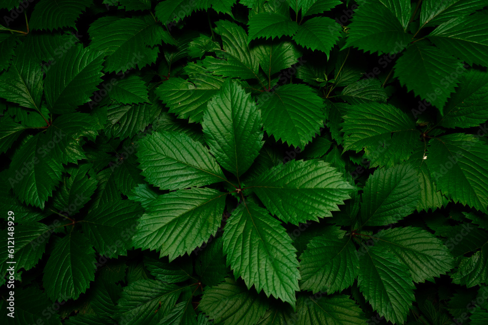 Beautiful green leaves of young plants in night darkness partially lit by light