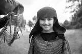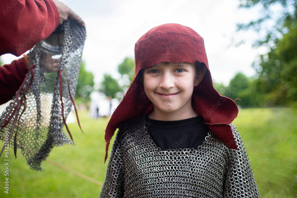 happy boy in the ring of the middle ages on a holiday, a smiling child actor in the costume of a knight of the middle ages